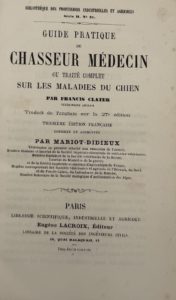 ▪ CLATER (Francis). Guide pratique du chasseur-médecin, ou traité complet sur les maladies du chien. Paris, E. Lacroix, s.d. In-12, demi-basane rouge, dos orné, initiales H. M. en queue, tête dorée (Reliure de l'époque). Troisième édition française, corrigée et augmentée par Simon Mariot-Didieux. On a relié en fin du volume 4 pp. manuscrites sur des remèdes pour guérir les maladies canines. De la bibliothèque du château d’Entrevaux, en Ardèche, avec cachet ex-libris. Tache d'humidité sur les mors, des rousseurs. Thiébaud, 207.