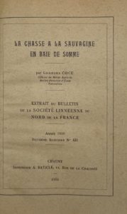 Chauny, A. Baticle, 1931. In-8 de 40 pp., bradel demi-maroquin grenat, couverture (P. Mouchon).Très rare tiré à part du Bulletin de la Société linnéenne du Nord de la France (année 1930, deuxième semestre, n°421) illustré de dessins et de photogravures dans le texte. Georges Cocu a publié la même année un volume plus conséquent intitulé La Chasse à la sauvagine, treize années d'observations et de chasses à la hutte de l'Estacade, près Saint-Valery-sur-Somme.