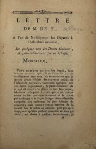 [FORGE (M. de)] — Lettre de M. de F... à l’un de Nosseigneurs les Députés à l’Assemblée nationale, sur quelques-uns des droits féodaux, et particulièrement sur la chasse. S.l.n.d. [vers 1790]. – Postscriptum. S.l.n.d.