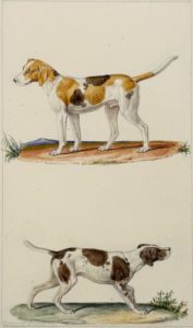 [PLANCHES]. MEUNIER, Jean-Baptiste (1786-1858) — Chiens de chasse. Aquarelle sur papier. 15 x 9 cm.
