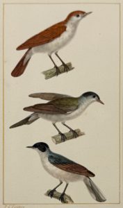 [PLANCHES]. PRÊTRE, Jean-Gabriel (1768-1849) — Luscinia megarhynchos, Rossignol philomèle. Sylvia atricapilla Mâle. Fauvette à tête noire Mâle. Sylvia melanocephala Mâle. Fauvette mélanocphale Mâle.