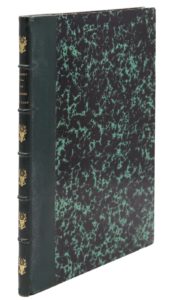 Paris, Mme Bouchard-Huzard, 1866. Petit in-4, demi-maroquin vert, dos orné de têtes de cerf de saint Hubert dorées, tête dorée, non rogné, premier plat de couverture (Reliure de l'époque).Seconde édition de ce poème sur la chasse du loup publié en 1624, établie conformément à l'édition originale (dont on ne connaît que deux exemplaires) avec une introduction de Louis Bouchard-Huzard.