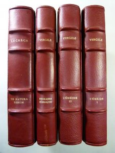 [CHIEZE - MAHN - LEGRAND].— VIRGILE. Les Bucoliques. Les Géorgiques.— L'Énéide.— LUCRÈCE. De Natura Rerum. Paris, Union latine d'éditions, 1955-1958 ; 4 vol. in-8, reliures de l'éditeur chagrin vernis rouge, dos à nerfs, têtes dorées,...