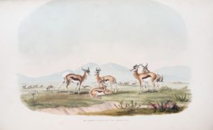 « One of the rarest of all books dealing with African big game and sport, this monumental presentation depicts wild game of Southern Africa as encountered and studied by Harris. The tinted lithographs highlighted in color by hand are especially lovely and makes this volume exceptionally desirable. Included among the portraits are elephant, buffalo, rhinoceros, lion, leopard, kudu, roan, eland, quagga etc. Each of the illustrations is also enlivened by scenic backgrounds of the habitat. The portraits are highlighted with Harris' detailed descriptions of the game, habitat and with occasional mention of his hunting adventures. » (Czech).