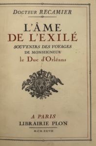 On joint : RÉCAMIER (Joseph). L'Âme de l'exilé. Souvenirs des voyages de Mgr le Duc d'Orléans. Paris, Plon, 1927. In-4, demi-chagrin rouge avec coins, dos orné, tranches mouchetées, premier plat de couverture (Reliure de l'époque). Édition originale, ornée de 83 illustrations photographiques, dont un portrait du duc d’Orléans en frontispice et 41 planches hors texte. Thiébaud, 706.