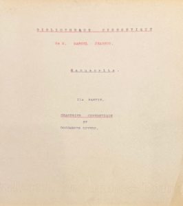 Tapuscrit de plus de 200 pp., en feuilles. Intéressant témoignage sur la bibliothèque cynégétique de Marcel Jeanson, établi par son bibliothécaire Paul Langeard (1893-1965). Ce tapuscrit est accompagné d'une boîte renfermant de nombreuses fiches manuscrites décrivant les livres et manuscrits de la bibliothèque Jeanson.