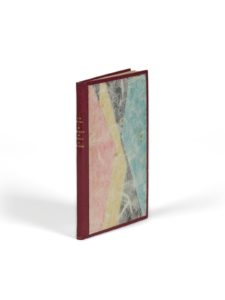 1948. Leporello replié en plaquette in-16, demi-maroquin mauve à cadre, plats de papier de mûrier de tons pastel, dos lisse, tête dorée, non rogné, couverture, étui bordé (Alix).Ces quatre poèmes imprimés sur un feuillet replié sont ornés d'un dessin gravé d'après Roger Toulouse.