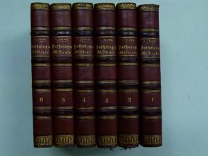 6 vol. in-8, demi-chagrin rouge, dos à nerfs ornés de motifs et filets dorés, tranches marbrées, [Rel. de l'époque]. Rare ensemble complet de l'édition originale de la Pathologie médicale de Frank, formant la deuxième division de l'Encyclopédie des sciences médicales. Bon exemplaire en reliures de l'époque, malgré un plat endommagé et de petits frott. aux coiffes