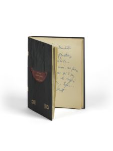Paris, Paul Morihien, 1949. In-12, plats rapportés en rim noir et marron, pièce de titre de box roux et incrustations de box gauffré sur le premier plat, dos muet en box beige, coutures apparentes sur lanières de box sable, doublures de porc-velours beige, gardes de papier noir, non rogné, couverture et dos, chemise et étui (J. de Gonet, 1993).Édition originale, ornée de deux portraits de Genet à la colonie pénitentiaire de Mettray.