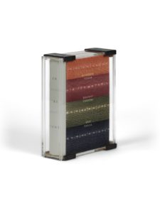 Paris, José Corti, 2002. In-12, reliure à plats rapportés en galuchat de roussette divisés en quatre bandes horizontales de teinte orangée, rose, verte et bleue comportant les noms et les prénoms des six interviewers à l'œser blanc de part et d'autre des jointures, dos lisse de box gris titré à l'œser bleu et gris, doublures et gardes de porc-velours gris, non rogné, couverture et dos, boîte de plexiglas transparent munie de quatre renforts de bois peint en noir (Antonio P[erez]-N[oriega]).Édition originale.