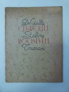 GRAMBERT. De Gaulle, Churchill, Staline, Roosevelt, Truman. S.l., s.n., 1945 ; in-4, en ff., chemise imprimée à rabats. Recueil de 5 caricatures reproduites. Rarissime. Bien complet de la chemise d'origine (petites déchirures au dos).