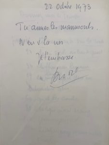 Envoi autographe signé de l'auteur à un amateur de manuscrits : Tu aimes les manuscrits. En v'là un. Je t'embrasse. André.