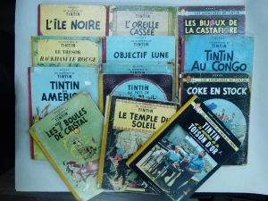 (2 ex. de deux tirages différents).— Tintin au Pays de l'or noir.— Les Bijoux de la Castafiore.— Tintin au Congo.— Coke en stock.— Les 7 boules de cristal.— Le Temple du soleil.— Tintin et le mystère de la Toison d'or. Cartonnages frottés, quelques accrocs.