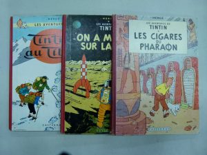 HERGÉ. Les Aventures de Tintin. Les Cigares du Pharaon.— Tintin au Tibet.— On a marché sur la lune. Paris, Casterman, 1954-1962 ; 3 vol. in-4, cartonnages de l'éditeur illustrés. Cartonnages un peu frottés. Intérieur correct.