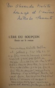 – L’Ère du soupçon. Essais sur le roman. Paris, Gallimard, 1956. In-12, reliure révorim, dos de basane rouge, couverture et dos ([J. de Gonet]). Édition originale. Exemplaire du service de presse. Il n’a pas été tiré de grands papiers. Envoi autographe signé de Nathalie Sarraute à Alexandre Vialatte. Celui-ci écrivit peu après à Jean Paulhan : « Je fais amende honorable à Nathalie Sarraute. […] Je n'ai pas fini de lire L'Ère du soupçon, mais j'admire beaucoup : c'est intelligent, lucide, net, pensé, ferme, bien exprimé et important... » (Correspondance Vialatte-Paulhan, lettre du 9 avril 1956, p. 235).