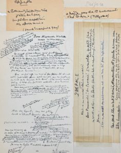4 ff. de notes autographes préparatoires, en feuilles, sous emboîtage de papier glacé crème ([Julie Nadot]).Dossier comprenant 4 ff. de notes préparatoires pour ce roman posthume : Note pour Luc de Capri (passage sur le style), 2 ff. de collages autographes (essais de titres, épigraphe, préface, etc.), ainsi qu'un tapuscrit sur papier pelure de la lettre à Michel Simon qui ouvre l'édition originale.