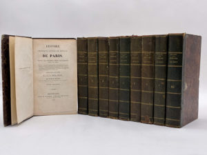 double filets dorés, auteur, titre et tomaison en lettres dorées, plats de papier à décor raciné. Reliure de l'époque. Environ 500 pages par volume, 85 gravures sous serpente hors-texte. Ensemble frotté, certains dos passés, une coiffe envolée et un mors partiellement fendu. Quelques rousseurs et brunissures. Quatrième édition de cette importante étude sur l'histoire de Paris, depuis les premiers temps historiques jusqu'à la publication de l'ouvrage, par l'historien français Jacques-Antoine Dulaure. On y trouve, par ordre chronologique, la description des accroissements successifs de cette ville et de ses monuments anciens et modernes, la notice de toutes ses institutions, tant civiles que religieuses, ainsi que le tableau des mœurs, des usages et des progrès de la civilisation. Cette quatrième édition est ornée 85 planches de gravures représentant les monuments et édifices principaux de la capitale. Ouvrage complet en 10 volumes aux éditions composites : quatrième édition pour les tomes 1 à 9, deuxième édition, parue en 1824, pour le volume de table (Tome 10). Bon ensemble homogène pour cette histoire de Paris richement illustrée.