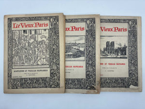 premier plat. 77 pp. ; 89 pp. ; 99 pp., nombreuses illustrations en N&B in et hors-texte, lettrines ornementées rouges et noires. Titre imprimé en noir et rouge dans un encadrement historié. Couvertures usées et brunies par endroits. Coutures lâches, rares rousseurs ; intérieurs propres. Édition originale non numérotée. Ensemble des trois premières séries de cet ouvrage sur le Vieux Paris, publié sous la direction de Gustave Lenotre et richement illustré de photographies en noir et blanc dans le texte et à pleine page. Une charmante publication sur le vieux Paris et ses lieux emblématiques.
