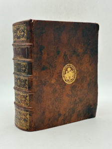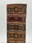orné de fleurons dorés et du titre en lettres d'or sur pièce de cuir maroquiné rouge, fer de la chambre de lecture de Quimper doré sur les plats, tranches rouges. Reliure de l'époque. Environ 2000 pages, vignettes de titre gravés, bandeaux héraldiques et lettrines ornementées. Plusieurs tableaux dépliants. Un mors fendu sur 7cm au premier plat, une amorce de fente au second, légères épidermures et frottements sur les plats, coins dénudés. Traces de mouillures claires sur les premiers et derniers feuillets, intérieur très clair partout ailleurs. Rare et très intéressant recueil contenant tous les édits royaux de l'année 1780. Il est précédé du Compte rendu au roi de Necker donnant l'état des finances pour l'année 1780, d'un index, et d'une table chronologique. Bel exemplaire de l'époque, provenant de la chambre de lecture de Quimper dont le fer est doré sur les plats.