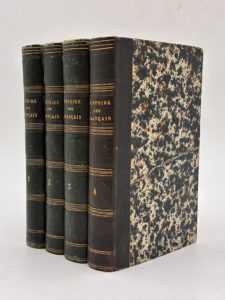 pointillés dorés, titre et tomaison en lettres d'or, tranches mouchetées. Reliure de l'époque. II, 1 ff.n.ch, 460 pp. ; 492 pp. ; 524 pp. et 8 pp. de catalogue ; 559 pp. Frottements sur le cuir. Quelques rousseurs aux premiers feuillets et dans les marges. Troisième édition de cette Histoire des français, depuis le temps des gaulois jusqu'à la restauration, du point de vue d'un Orléaniste, Théophile Lavallée, qui fut par ailleurs le premier théoricien français de la géographie militaire. Complet des 4 tomes en 4 volumes, composés comme suit : Tome 1. Histoire des gaulois, histoire des francs, histoire des Français jusqu'en 1328. Tome 2. Histoire des Français sous les Valois, ou la France constituée en monarchie féodale avec les Etats-Généraux, âge de transition de la Féodalité. Tome 3. Histoire des Français sous les Bourbons (1589-1789). Tome 4. Histoire de la Révolution (1789-1830). Ensemble homogène hormis pour le tome 4, relié en demi-chagrin anthracite. Agréable ensemble, intérieurs très frais.
