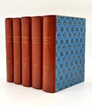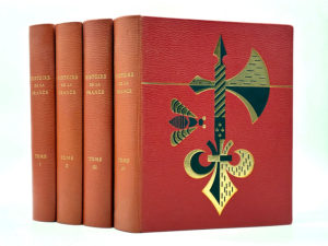 francisque et une abeille en noir et doré, gardes de toile illustrées d'après une composition de Jean Picart Le Doux, toutes tranches dorées, sous étui cartonné. Reliure moderne. 272 ; 268 ; 288 ; 289 pages, 72 gouaches à pleine page, 2 suites des illustrations sur Hollande et sur Vélin du Marais. Dos très légèrement insolés. Édition originale de cette histoire de France depuis la Gaule romaine jusqu'à la quatrième république, publiée sous la direction littéraire de Pierre Lyautey et artistique Raymond Cogniat. Elle est illustrée de 72 magnifiques gouaches réalisées par vingt-deux peintres de l'École de Paris, dont Michel Ciry, Grau Sala, Louis Touchagues, Yves Brayer, Buffet... La composition sur toile des pages de gardes a été faite d'après un carton original de Jean Picart le Doux à qui est dû également le décor de la reliure. Tirage limité à 6300 exemplaires, celui-ci l'un des 530 sur Arches, N°CLXXV, auquel sont jointes deux suites des illustrations, sur Hollande et sur Vélin du Marais. On joint le Fascicule de l'exposition Histoire de la France et École de Pairs inaugurée le 3 décembre 1962 à la Galerie Drouant, contenant une préface, une notice et un portrait de chaque artiste. Luxueuse édition illustrée par de célèbres artistes, complète en 5 volumes en excellent état.