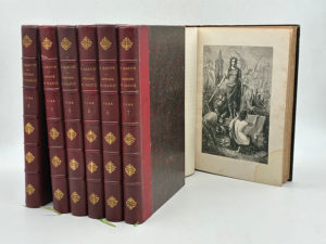 dorés, titrage et tomaison en lettres d'or, tranches mouchetées, signets conservés. Reliure de l'époque. VIII et 588 pp. ; 580 ; 596 ; 608 ; 572 ; 556 ; 551 pages, très nombreuses illustrations en noir, dont 1 portrait de l'auteur gravé en frontispice du tome 1, 7 vignettes de titre gravées (distinctes à chaque volume), et de nombreuses vignettes gravées en noir dans le texte. Texte sur deux colonnes. Menus frottements, dos légèrement brunis, quelques traces blanches et griffures sur les plats. Quelques rousseurs pâles dans les marges, trace de mouillure marginale, sinon intérieurs très propres. Célèbre histoire de France d'Henri Martin (1810-1883) dans sa version populaire en impression sur deux colonnes et illustrée. Cette œuvre valut à son auteur un prix de 20 000 francs de la part de l'Institut en 1869. En association avec Paul Lacroix, il imagina une histoire de France composée d'extraits des principaux chroniqueurs et historiens et destinée à combler les vides pour les périodes manquantes. Au sommaire : Tome 1 : Des Gaulois à Louis XI. Tome 2 : Des guerres d'Italie à Louis XIV. Tome 3 : De Louis XIV à la chute de la Royauté. Tome 4 : De la Convention Nationale au Consulat. Tome 5 : De l'Empire à la Monarchie de Juillet. Tome 6 : de la Monarchie de Juillet au Second Empire. Tome 7 : Du Second Empire à la Troisième République. Bel ensemble homogène et complet en 7 volumes pour cette histoire populaire de France accompagnée d'une très riche iconographie.