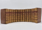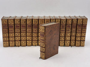 veau marbré brun, dos à nerfs ornés de fleurons dorés, titre et tomaison dorés sur pièce de maroquin bordeaux, coiffes guillochées, filet doré sur les coupes, tranches jaspées bleues. Reliure de l'époque. Environ 600 pages par volume, 14 cartes et plans dépliants d’après J.-B. Bourguignon d'Anville. Infimes frottements et griffures, petits trous de vers sur un mors du tome 1, sinon très bel ensemble. Édition originale de cette importante histoire romaine de Charles Rollin (1661-1741), illustrée de 14 cartes et plans dépliants d'après Jean-Baptiste-Bourguignon d’Anville, l’un des géographes français les plus renommés du XVIIIe siècle. Seuls les volumes 1 à 8 ont été rédigés par Rollin lui-même ; les volumes suivants (9 à 16) sont l’œuvre de l’un de ses disciples, M. Crévier, professeur de rhétorique à l’Université de Paris 3. Ex-libris héraldique avec la devise latine "Virtute Nitet" ("Le pouvoir brille") gravé au contreplat. Riche ensemble, complet en 16 volumes finement reliés à l'identique.