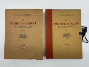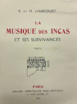 à lacets en demi-percaline ocre. Volume de texte : 3] ff. (faux titre, du même auteur, titre, dédicace), une planche sous serpente, VII (avant-propos), 575 pp., 1] f. (errata), avec 23 figures en noir dans le texte. Volume d'Atlas : 2] ff. (faux titre, du même auteur, titre) ; 23 pp. (table descriptive des planches) ; 39 planches. Titres imprimés en noir et rouge et ornés d'une vignette. Dos frotté, déchirures aux mors et sur une partie du premier plat pour le volume de texte. Dos insolé sur la chemise de l'atlas, quelques rousseurs sur les feuillets de faux-titre et titre. Édition originale de ce remarquable travail sur la musique précolombienne et plus particulièrement celle des incas, dû au couple de musicologue M. et Mme d'Harcourt. Elle se compose d'un volume de texte, qui contient une description technique des instruments incas (les sonnailles et les bruiteurs, les tambours et les xylophones, la trompe, la syrinx, la flûte verticale et le flageolet, les sifflets et les ocarinas et les instruments à cordes), une partie consacrée aux fêtes et aux danses de l'ancien Pérou et du Mexique, une partie sur le folklore musical, ainsi qu'une partie consacrée aux notations musicales et poétiques, où sont répertoriées 204 mélodies, la plupart notées sur place ou recueillies auprès de personnes natives d"Amérique du sud. Il est accompagné d'un album de 39 planches en phototypie, dont plusieurs en couleur, montrant des instruments, scènes de danse, rituels et pratiques musicales. Bon exemplaire de cette passionnante étude sur la musique précolombienne et ses survivances modernes. Complet en 2 volumes.