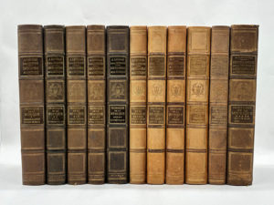 encadrement doré aux entrenerfs dont l'un orné d'une lyre entourée d'une couronne de laurier, lettrines or sur pièces de cuir brun, nom de l'éditeur doré en pied, tranches de tête rouges, signets conservés. 3403 pp. ; 3436 pp. (pagination continue), partitions et nombreuses illustrations en noir dans le texte. Impression sur deux colonnes. Dos insolés, menus frottements. Certaines pages légèrement roussies dans les marges, rares rousseurs sur le papier et sur les tranches. Monumentale encyclopédie musicale publiée par Albert Lavignac (fondateur et auteur principal) et Lionel de La Laurencie (directeur scientifique et éditeur). Elle se compose de deux parties : la première, en 5 volumes, propose une histoire de la musique d'un point de vue chronologie et biographique ; la seconde, en 6 volumes, traite de la technique, l'esthétique et la pédagogie (physiologie auditive, technique instrumentale (vents, percussions, cordes), orchestration, musique liturgique, esthétique, éducation musicale). L'ensemble se décompose comme suit : - Première partie : Histoire de la musique (Tome I: L'Antiquité et le Moyen Age ; Tome II: L'Italie et l'Allemagne ; Tome III: France, Belgique, Angleterre ; Tome IV: Espagne, Portugal ; Tome V: Autres pays.) - Deuxième partie : Technique - esthétique - pédagogie (Tome I: Tendances de la musique, Technique générale ; Tome II: Physiologie vocale et auditive, Technique vocale et instrumentale ; Tome III: Technique instrumentale (Instruments à vent, instruments à percussion, instruments à cordes, instruments automatiques) ; Tome IV: Orchestration, Musique liturgique des différents cultes ; Tome V: Esthétique ; Tome VI: Pédagogie, Écoles, Concerts, Théâtres). Bon ensemble homogène et complet en 11 volumes pour cette œuvre phare de la musicologie française du début du XXe siècle.