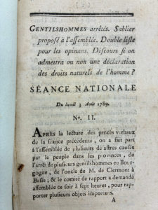 qui se sont tenue à l'Assemblée Nationale le 3 Août 1789 (N°11) et le 25 juillet 1789 (N°24). La première, qui eut lieu la veille du serment du jeu de paumes, a pour thème : "Gentilshommes arrêtés. Sablier proposé à l'assemblée. Double lise pour les opinans. Discours si on admettra ou non une déclaration des droits naturels de l'homme ?". Bel exemplaire broché sous couverture d'attente, intérieur très propre.
