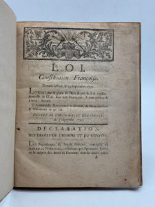 [CONSTITUTION]. Loi. Constitution française. Donnée à Paris, le 14 septembre 1791. Précédé de la Déclaration des droits de l'Homme et du Citoyen. À Paris, de l'Imprimerie Royale, 1791. De format In-8. Demi-vélin crème à la bradel, titre en...