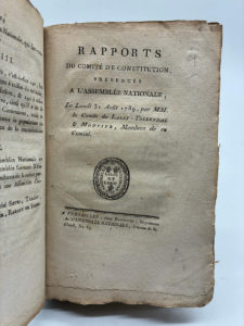 [CONSTITUTION]. Recueil de rapports du comité de constitution (1789-90). De format In-8 à la bradel. Demi-vélin crème, dos lisse titré noir. Reliure postérieure. Vélin bruni par endroits. Quelques petites piqûres et traces de mouillures....