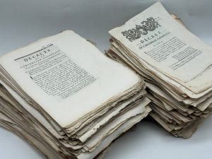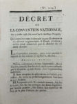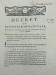 sinon bon état de l'ensemble. Certains décrets sont en double ou triple exemplaire. Exceptionnel ensemble d'environ 500 décrets pris par l'Assemblée puis la Convention Nationale entre 1791 et 1793. L'ensemble traite de sujets majeurs touchant à la société, à l'agriculture, aux immigrés, à la vente des châteaux, aux fonctionnaires, au tribunal révolutionnaire, à la mémoire de Bara, au paiement des contributions publiques…. Il contient notamment le décret du 17 juillet 1793 qui marque l'abolition totale des privilèges féodaux en France sans indemnité pour les seigneurs ; il supprime toutes les redevances, droits féodaux, seigneuriaux, censuels, fixes ou casuels, y compris ceux conservés par le décret du 23 août 1792, et ordonne leur brûlement public. Très riche documentation sur la période révolutionnaire, en bonne condition.