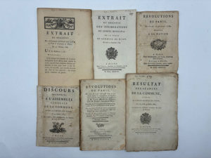 effrangés, papier quelque peu jauni par l'âge. Ensemble de six documents officiels de la période révolutionnaire, imprimés à Dijon en 1789, comprenant : - Discours prononcés à l'Assemblée générale de la Commune, tenue à l'hôtel-de-ville le 27 juillet 1789, où s'opéra, avec acclamation, la réunion de tous les ordres. Dijon, Causse, 1789. 9 pp., avec une vignette de titre et un bandeau gravé. - Révolutions de Paris, du 12 au 17 juillet 1789, dédiées à la nation. À Paris chez Prudhomme et à Dijon chez Bidault, 1789. 29 pp. - Révolutions de Paris ou suite de ce qui s'est passé dans la Capitale depuis le 18 jusqu'au 26 Juillet, précédée du Cri de douleur de la Nation Françoise, & suivi du Triomphe de M. Necker. À Paris chez Prudhomme et à Dijon chez Bidault, 1789. 58 pp. - Extrait du registre des délibérations du Comité municipal de Dijon du 31 octobre 1789. Dijon, Causse, 1789. 7 pp. avec un bandeau gravé, non coupé ni rogné. Ce document traité des députés qui se sont retirés avant l'achèvement de la Constitution. - Résultat des séances de la Commune tenues en l'Hôtel-de-Ville de Dijon (27, 28 & 29 juillet 1789). Dijon, Causse, 1789. 17 pp. in-8 non coupé ni rogné, avec un bandeau gravé. (légères mouillures en marge, petite déchirure au centre du premier feuillet) - Extrait du registre des délibérations du comité municipal de la ville et commune de Dijon, le lundi 14 septembre 1789. Dijon, Causse, 1789. Bon état général pour cette intéressante documentation sur la période révolutionnaire.
