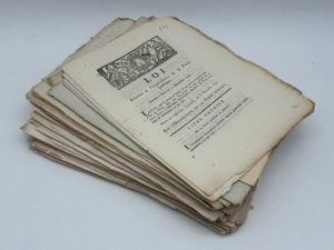 [LOIS]. Ensemble de 68 lois publiées entre décembre 1790 et septembre 1792. 68 plaquettes en feuillets simples ou doubles de format in-4 (21 x 27 cm), nombreux bandeaux gravés. Quelques marques de pliure et mouillures légères, petits trous dans...