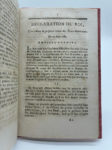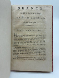 piqûres sans gravité. Édition à la date de l'originale. Il s'agit du texte de la très importante "séance royale" du 23 juin 1789, durant laquelle Louis XVI, sans la présence de Necker, essaie de reprendre la main face aux initiatives des députés des États-Généraux, qui viennent de se déclarer "Assemblée Nationale". À travers ses discours et déclarations, le roi expose un programme de réformes qui sera repris par les Monarchistes tout au long de la Révolution puis de la Restauration au XIXe, notamment par Louis XVIII. Exemplaire provenant de la bibliothèque du collectionneur et poète suisse Jean Paul Barbier-Mueller, avec son ex-libris au contreplat. Bel exemplaire de ce texte qui marque un tournant dans les préludes de la Révolution française.