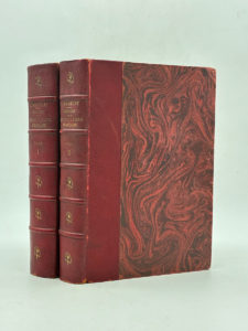 tomaison dorés, plats de papier à décor jaspé. LXIV, 1008 pp., IV ; de 1009 à 1968 pages et IV, nombreuses gravures en N&B dans le texte dont certaines à pleine page. Menus frottements aux coiffes et mors, coins et certaines coupes usés. Pages légèrement brunies et très rares rousseurs dans les marges. Édition populaire richement illustrée de cette célèbre Histoire de la Révolution Française de Jules Michelet. Exemplaire truffé d'une planche gravée par Le Mire d'après Moreau le Jeune ("Le premier baiser de l'amour"). Ex-libris héraldique au contreplat. Bon ensemble uniforme, complet en 2 volumes.