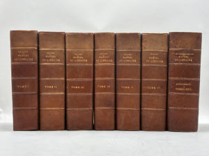 1500 pages par volume, impression sur 2 colonnes. Menus frottements, certains dos légèrement passés. Intérieurs intacts. Cinquième édition originale entièrement refondue et augmentée d'un tiers par l'auteur de de ce monument de la bibliographie pour les livres anciens et rares. Bon ensemble complet en 7 volumes.