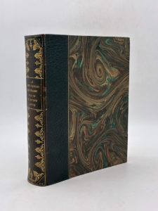filet doré, dos lisse fleuronné et titré en or, tranche de tête dorée, couverture conservée. 184 pages, 104 planches hors-texte en héliochromie et en héliotypie dont certaines sous serpentes, le tout monté sur onglets. Vignette de titre, bandeaux, lettrines et culs-de-lampe. Titre imprimé en noir et rouge, dans un bel encadrement ornementées sur la couverture d'origine. Dos légèrement insolé, menus frottements. Édition originale‎ de cet ouvrage collectif autour de l'exposition consacrée à l'histoire du livre en France, des origines à la fin du second empire, organisée en avril 1923 au Pavillon de Marsan. Le texte est de Henry Martin, André Blum, Ch. Mortet, Mlle J. Duportal, Louis Réau, Frantz Calot, Amédée Boinet et le Comte Durrieu. Il s'accompagne de nombreuses œuvres reproduites en héliochromie et en héliotypie sur des planches hors-texte. Au sommaire : Les manuscrits à peintures - Le livre à gravures du XVème siècle - Le livre à gravures du XVIème siècle - Le livre à gravures du XVIIème siècle - Le livre à gravures du XVIIIème siècle - Le livre illustré du XIXème siècle - La reliure - Les amateurs de livres en France depuis le Moyen âge jusqu'à la fin du second Empire. ‎ Tirage limité à 870 exemplaires, celui-ci l'un des 850 exemplaires sur vergé pur chiffon de Lafuma. Bel exemplaire décoratif pour cette étude exhaustive qui ravira les bibliophiles.