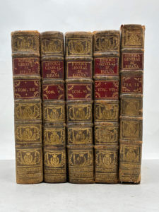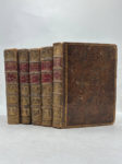 porphyre brune, dos à cinq nerfs ornés de caissons aux armes royales espagnoles, titre et tomaison dorés sur pièces de maroquin rouge, roulette intérieure, frises en encadrement sur les plats, tranches jaspées (reliure de l'époque). Environ 500 pages par volume, vignettes héraldiques gravées sur les titres, plusieurs vignettes gravées en tête de chapitres, quelques lettrines ornementées. Texte en espagnol. Ensemble frotté, coiffes abimées, quelques trous, coins dénudés. Intérieur propre et clair. Seizième édition de cette Histoire générale de l'Espagne, une référence en matière d'historiographie espagnole, œuvre du père Juan de Mariana (1536-1624), l'un des grands intellectuels du XVIe siècle. Cette nouvelle édition, parue entre 1783 et 1796, comporte des tables chronologiques, des notes et des observations critiques. Série incomplète : tomes 3, 5, 6, 7 et 9 uniquement. Ensemble homogène et élégant malgré l'usure du temps ; intérieurs très bien conservés.