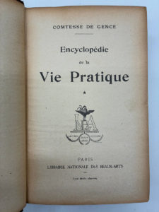 GENCÉ, Comtesse de. Encyclopédie de la vie pratique. Edité à Paris chez Librairie Nationale des Beaux-Arts en 1925. En 3 volumes de format In octavo / In-8. Demi-chagrin vert-canard. Dos lisses ornés de triple filets, auteur, titre et tomaison...