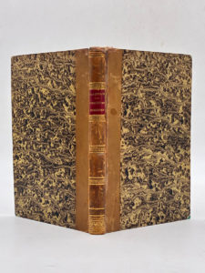 Lebrument en 1846. De format In-8. Demi-veau glacé blond, dos lisse orné de filets simples et spéciaux, frise dorée, auteur et titre en lettres d'or sur pièce de cuir maroquiné rouge, tranches mouchetées. XX, 86 pages et 8 planches hors-texte gravées par Polyclès Langlois, dont une en frontispice. Premier plat fragile (mors en partie fendu), languette de cuir décollée au dos, frottements. Manque à la page de titre (comblé par une page contrecollée au dos) avec très légère atteinte à la mention des lieux d'éditions, titre du second texte remplacé par son tapuscrit, quelques rousseurs dans les marges. Édition originale de cette étude recherchée sur les ornements des toits au Moyen-Age, par l'historien Eustache de la Quérière. Elle est illustrée de 8 planches gravées par Polyclès Langlois figurant plusieurs dizaines d'exemples de finitions des couvre-toits. À la suite : Recherches historiques sur les enseignes des maisons particulières suivies de quelques inscriptions murales prises en divers lieux, par Eustache de la Quérière, édité à Paris chez Didron et à Rouen chez François et Herpin en 1852. VII et 131 pages, une planche gravée en frontispice et 27 sujets gravés sur bois. Exemplaire bien complet de ses planches, intérieur frais.
