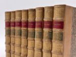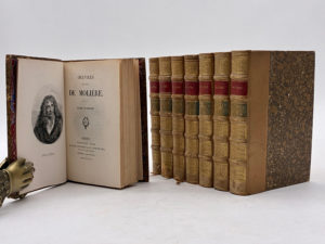 auteur et tomaison dorés sur pièces de cuir rouge et verte, têtes dorées, signets conservés. Reliure de l'époque. LXI et 348 pp. ; 347 pp. ; 435 pp. ; 359 pp. ; 437 pp. ; 339 pp. ; 389 pp. ; 434 pp., 1 portrait de l'auteur gravé par Jehotte d'après Desenne en frontispice du tome 1. Dos légèrement insolés, menus frottements aux coiffes, pièces de tomaison légèrement estompées. Intérieurs très frais. Soigneuse édition des œuvres complètes de Molière, ornée de son portrait en frontispice du tome 1. Elle contient une vie de l'auteur par Voltaire et son éloge par Chamfort. Somme complète en 8 volumes imprimés sur beau papier vergé. Bel ensemble homogène.