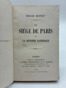 QUINET, Edgar. Le Siège de Paris et la défense nationale. Edité à Paris chez Lacroix et chez Verboeckhoven et Cie en 1871. De format In-8. Demi-chagrin bleu marine, dos lisse orné de double filets et pointillés dorés, lettrines or, tranches...