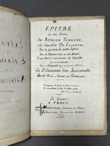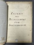 tout exetrait d'un manuscrit qui a pour titre Les délassements d'un jurisconsulte. Par M. B*** avocat au Parlement... Manuscrit à l'encre que papier, XVIIIe siècle. In-8, [80] pages, cartonnage bleu semé d'étoiles dorées à la Bradel début XXe s., pièce de titre basane brune, non rogné (rousseurs, salissures). Ce manuscrit est très probablement de la main de son auteur, C.-J.-F. Beaucousin (1723-1798). Né à Noyon, Beaucousin est reçu avocat au Parlement de Paris en 1751. Il fut bibliographe et étudia l'histoire littéraire. On lui doit quelques œuvres demeurées manuscrites, dont une histoire de Noyon, une vie de Racan ainsi que des notes pour une nouvelle édition de la Bibliothèque historique de la France. Peu de temps avant sa mort en 1798, il fut nommé bibliothécaire du Directoire exécutif (d'après portail Biblissima). Les pages 1 à 16 renferment une faux-titre, un avertissement en deux versions ; puis le texte lui-même commence page 17, par un faux-titre et un titre qui reproduit celui d'une édition, avec adresse et la date de 1789. Entre ces deux parties se trouvent 2 feuillets contenant 2 pages d'une note bibliographique à propos de ce manuscrit, datée de 1841, signée d'un paraphe et qu'une mention moderne attribue à Charles Nodier.