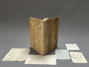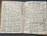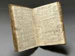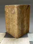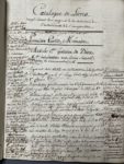 parchemin de réemploi (taches, essais de plume sur les plats et contreplats). Intéressant catalogue de la bibliothèque d'un « honnête homme » nantais. Ecrit à l'encre sur papier vergé, Il se compose de 100 pages chiffrées, suivies de 10 pages non chiffrées de tables. La collection est classée et décrite dans un ordre thématique, sur une large colonne, et presque toutes les marges ont été remplies par l'ajout de titres supplémentaires. Cette bibliothèque était d'une grande ampleur, à raison de 10 titres par pages elle représente déjà 1000 volumes, mais les ajouts doivent sans doute doubler ce nombre. Sont joints 5 feuillets volants contenant notamment une « liste de livres à lire ».
