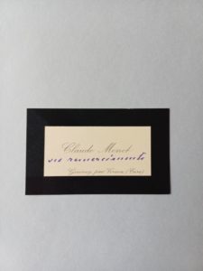 Claude MONET (1840-1926). Carte de visite à ses nom et adresse à « Giverny, par Vernon (Eure) », avec bordure de deuil. 57 x 95 mm. Enrichie de deux mots autographes : « ses remerciements ».