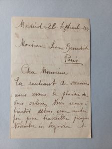 Valentin de ZUBIAURRE (1879-1963) ; Ramon de ZUBIAURRE (1882-1969). Lettre manuscrite signée « Valentin et Ramon de Zubiaurre », adressée à Léon (sic pour Léonce) Bénédite. Madrid, 30 septembre 1911. 3 pages in-12 (pli en 2, légers...