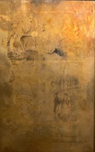 [Gravure]. COSŸNS (A. F.), grav. Matrice originale gravée sur cuivre, comportant deux scènes et en envoi au docteur Adolphe Olivier, médecin accoucheur de Hôpitaux de Paris, père du bibliophile Eugène Olivier.