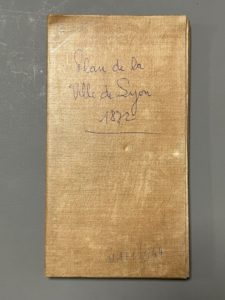 couleurs, env. 51 x 81 cm., entoilé, plié 20 x 11 cm. Beau plan de Lyon où le Rhone, la Saône et les fortifications sont teintés en vert. Mention des crues et des basses eaux sur le fleuve. Tirage de 1880 « après révision complète » selon la mention figurant hors du cadre. Titre ms. moderne au stylo au verso.